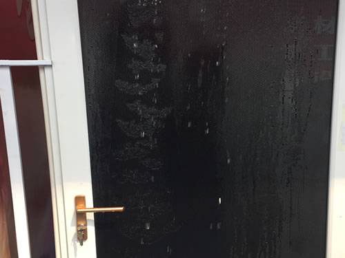 DVA mesh used as door screen outdoors for privacy protection and rain resistance.